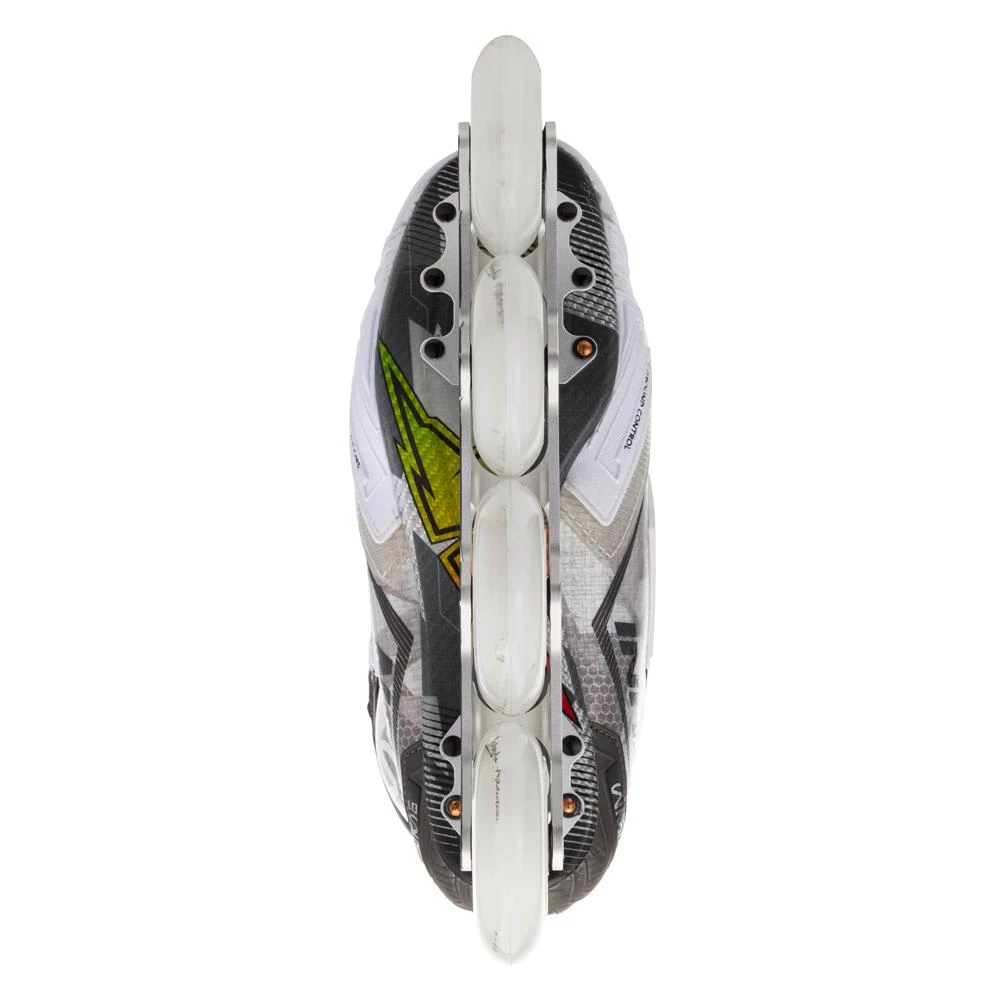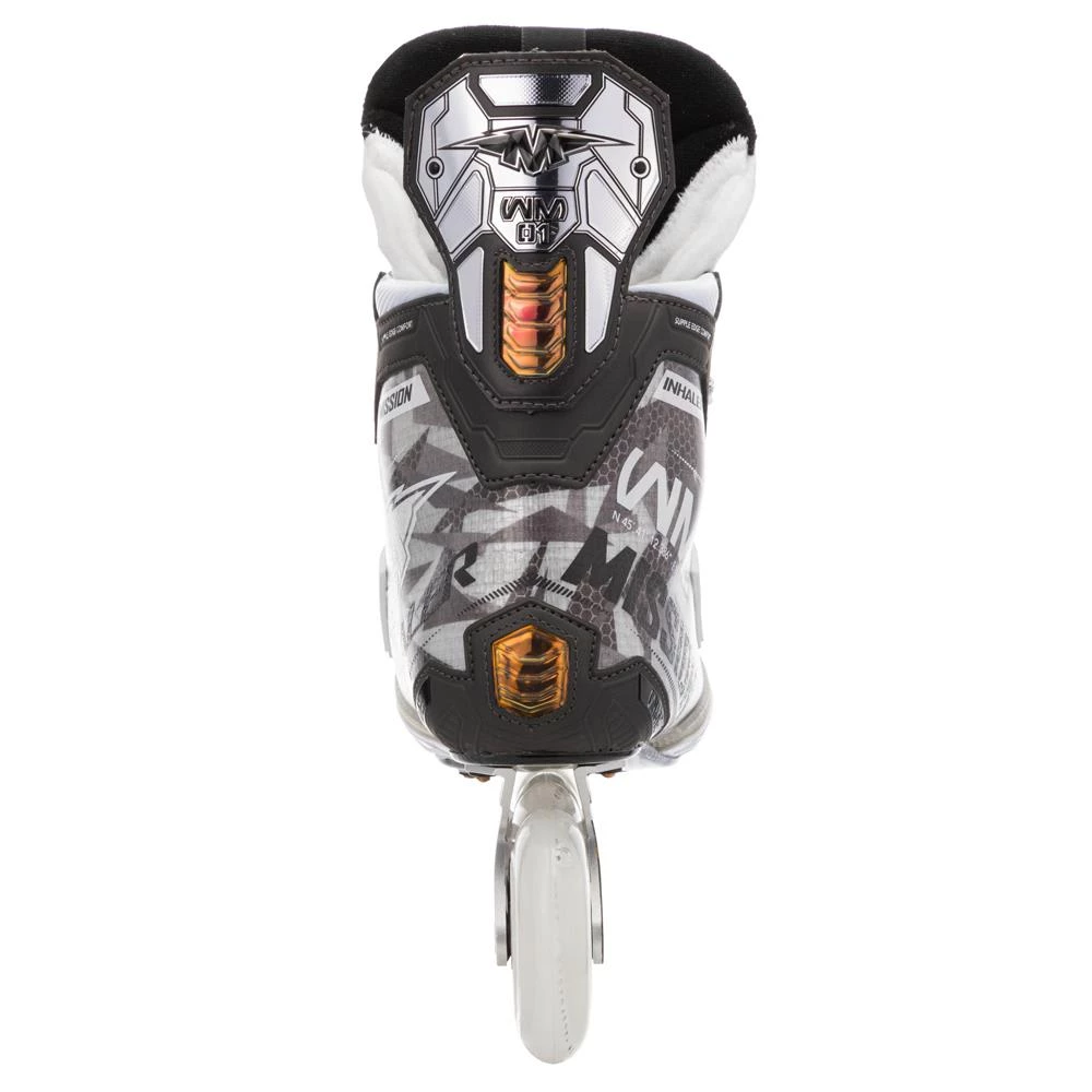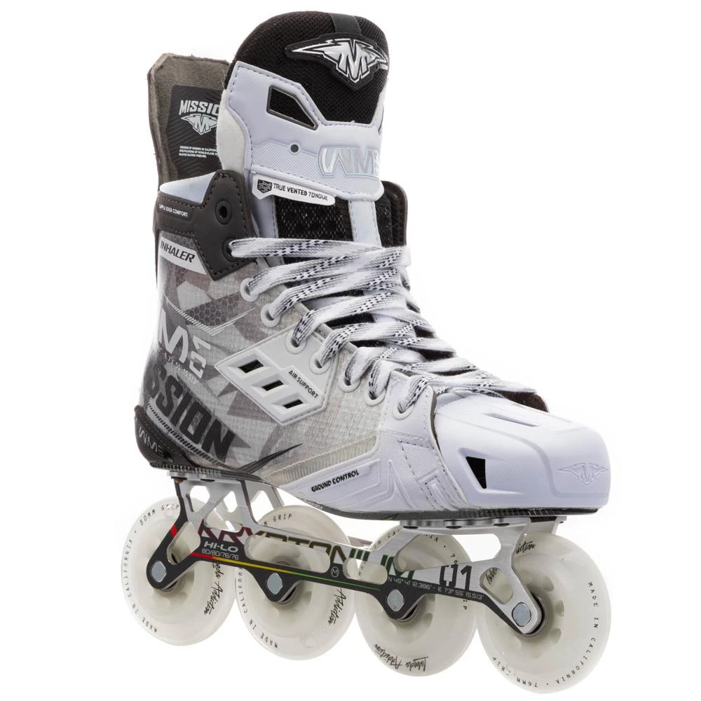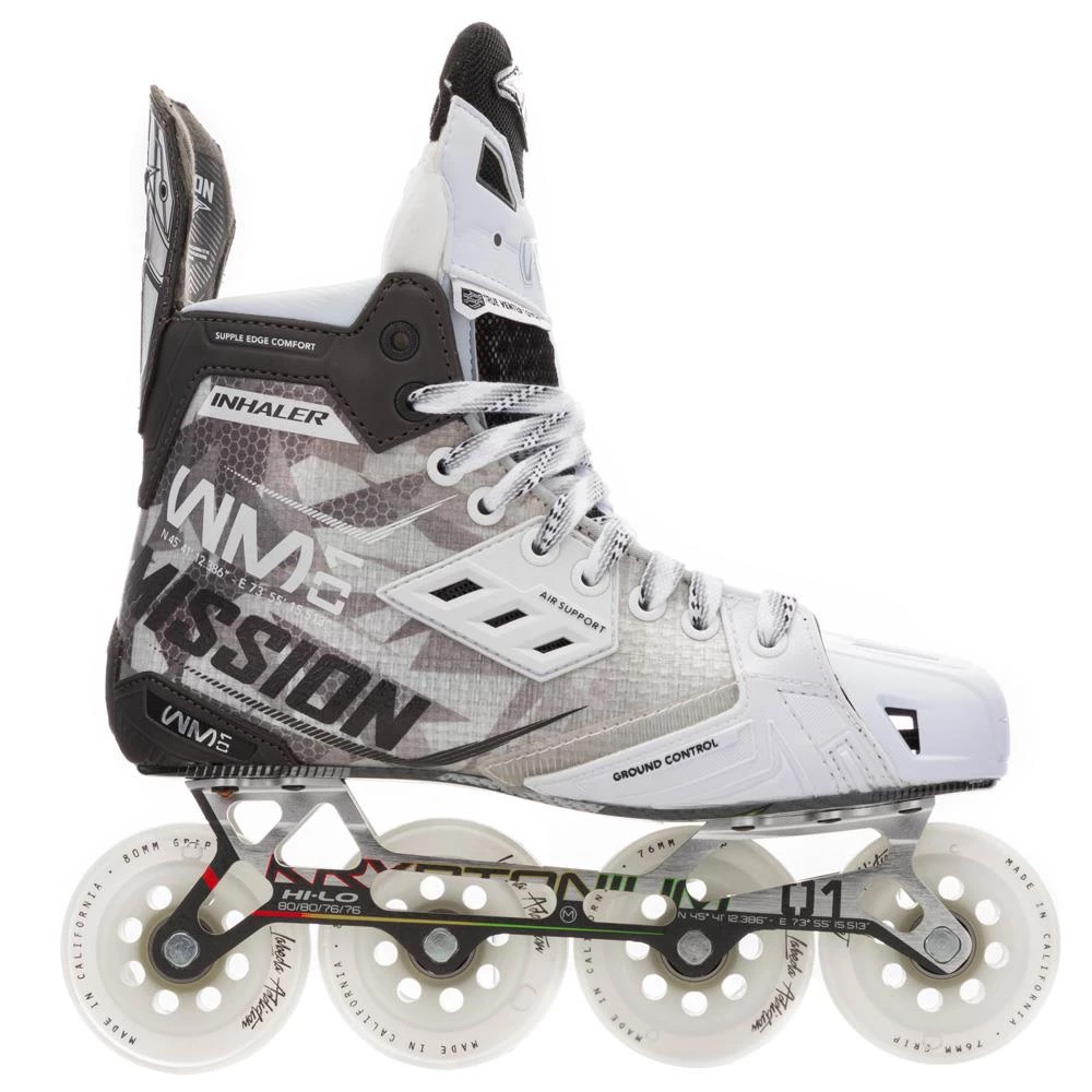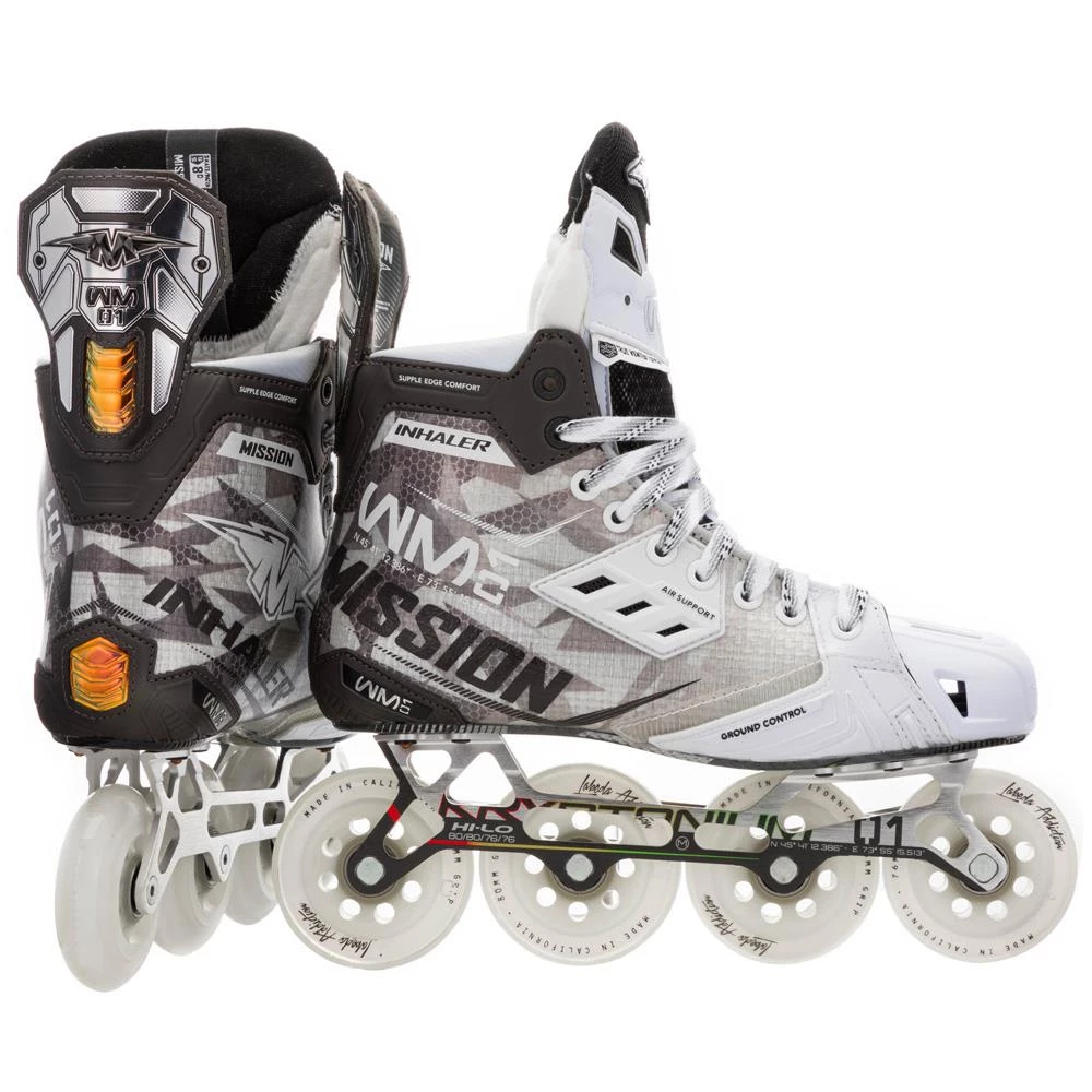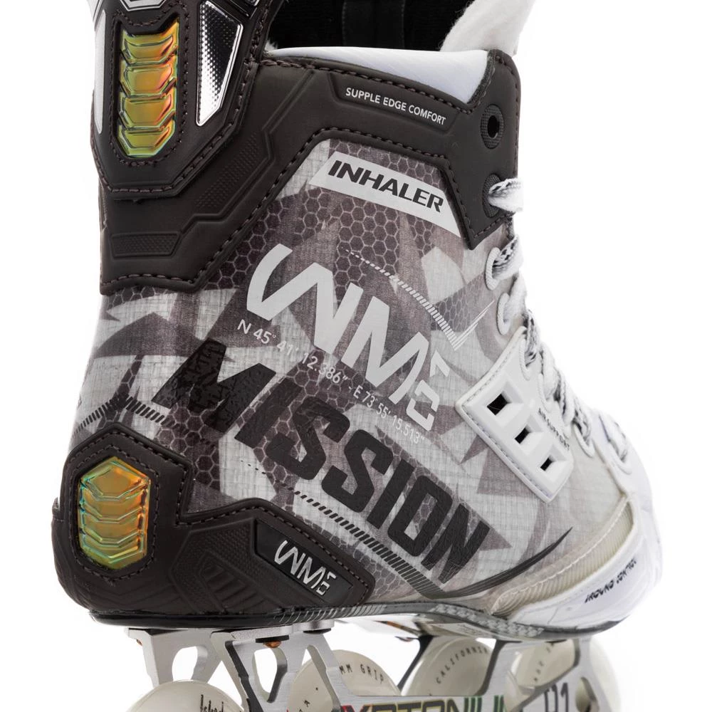 The Mission RH Inhaler WM01 inline skate offers top innovation to the player looking for an elite-level inline model with performance features found throughout the skate, from the boot to the wheels.